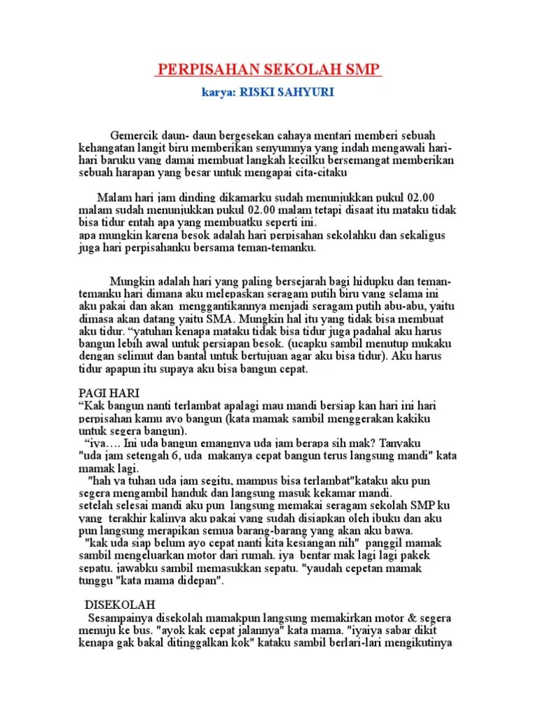 Mungkin saat duduk di bangku sekolah kita sudah tidak asing lagi, kita semua pasti pernah mendapatkan tugas untuk mengarang ataupun membuat cerpen. Contoh cerpen tentang perpisahan sekolah. 14 contoh pidato bahasa jawa tentang pendidikan perpisahan sekolah tausyiah agama acara halal bil halal sumpah pemuda nasionalisme ramadhan lingkungan. Jugamelengkapi kategory cerpen di blog ini. Sebelum itu, mari kita cari tahu dulu apa yang dimaskud cerpen.