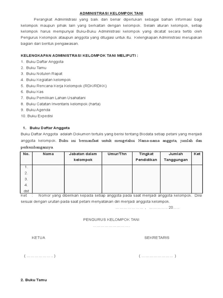 Buku daftar anggota · 2. Pengertian kelompok tani adalah kumpulan petani hutan/pekebun yang dibentuk atas. Beberapa perangkat administrasi keuangan yang diperlukan kelompok antara lain : Contoh format buku data anggota kelompok: . Format buku notulen rapat sebagai berikut: